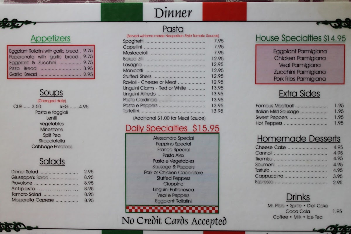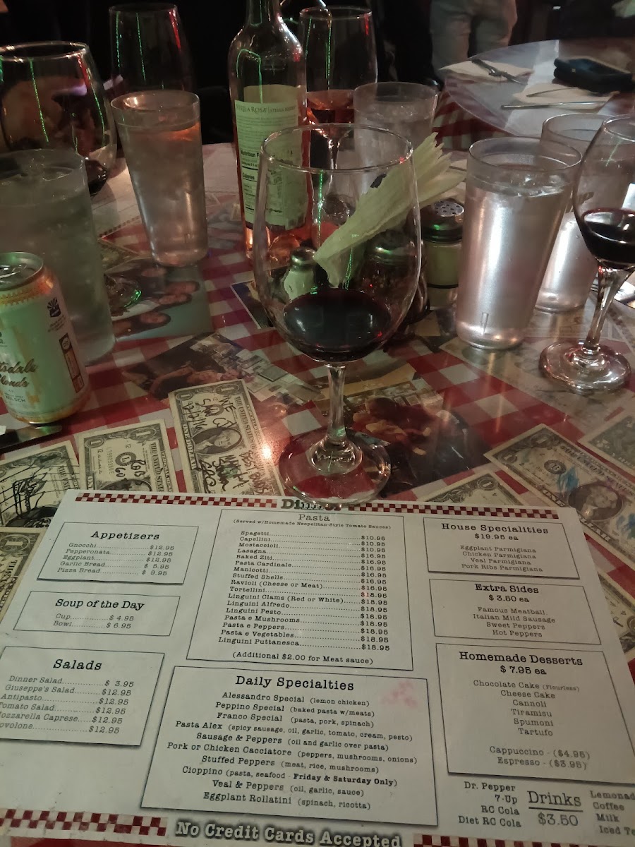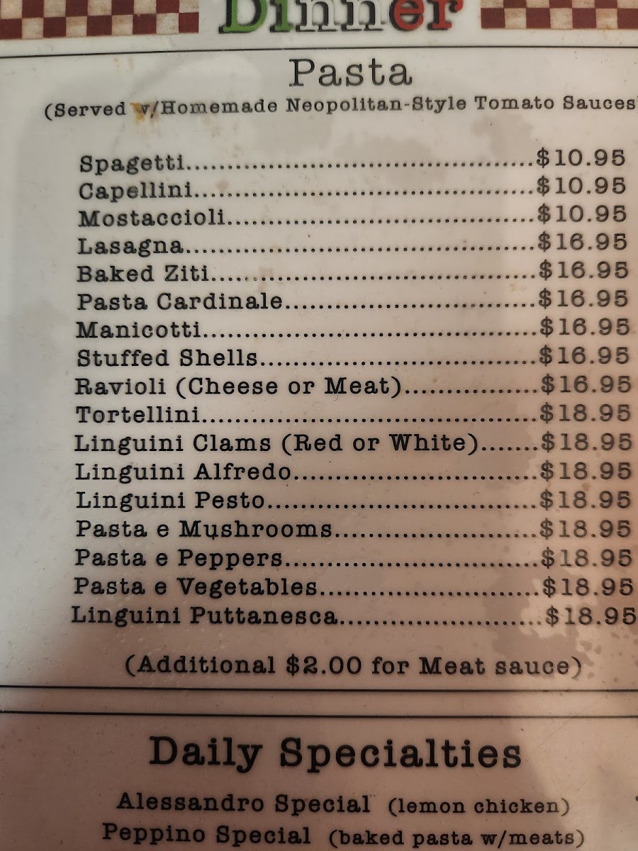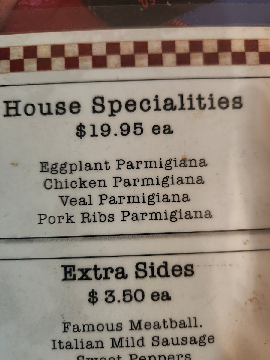 The menu boasts a delightful selection of house specialties, with favorites like the Chicken Parmigiana and Veal Parmigiana served alongside a generous side of pasta in rich tomato sauce, all priced around $21.95 and $11.95 respectively. For a truly memorable conclusion to your meal, indulge in their homemade desserts, including the exquisite Tiramisu and Cannoli.